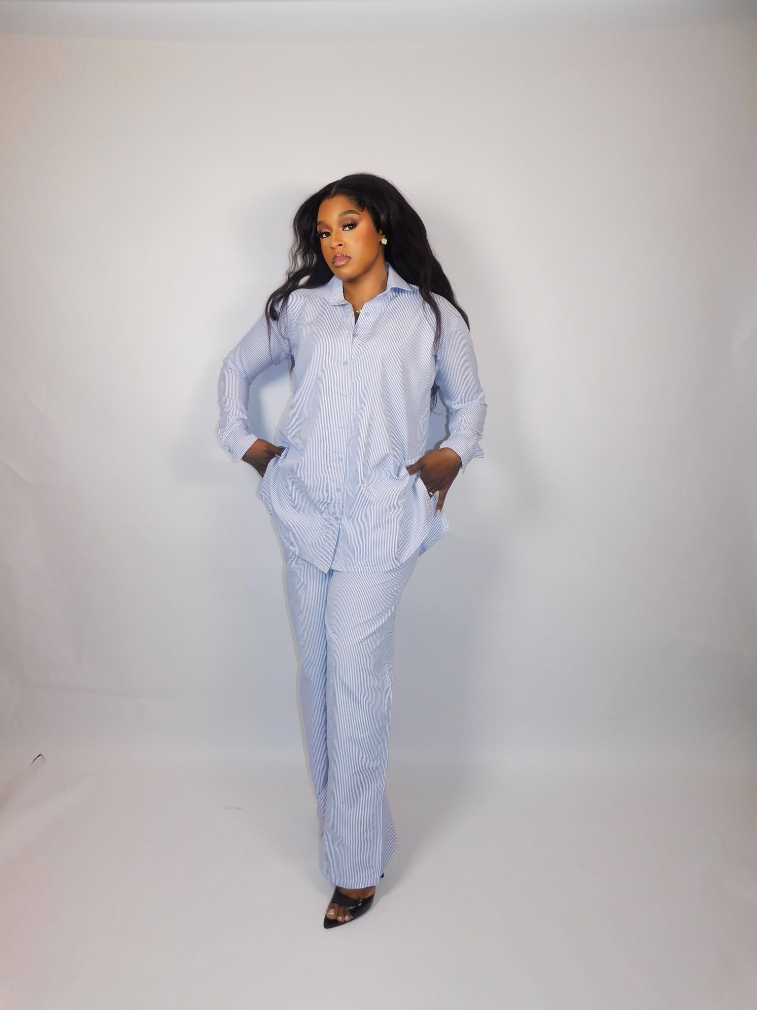 Confectionné dans un tissu léger et fluide à rayures subtiles bleu ciel, il se compose d’une chemise oversize et d’un pantalon droit, offrant un confort absolu et une élégance décontractée.