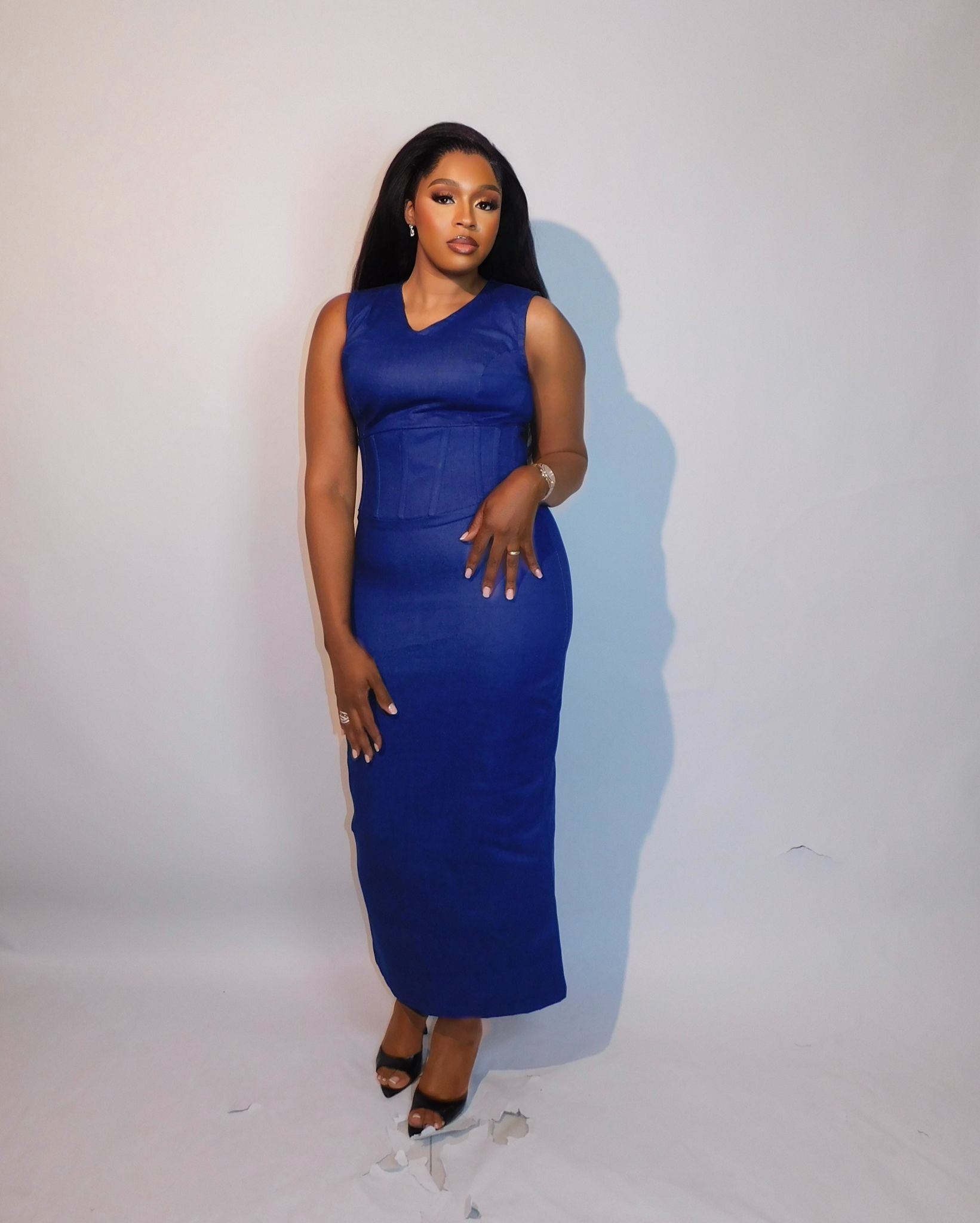Son corset intégré sculpte la taille et met en valeur les courbes, tandis que sa longueur midi et sa fente arrière subtile apportent une touche de grâce et de modernité.