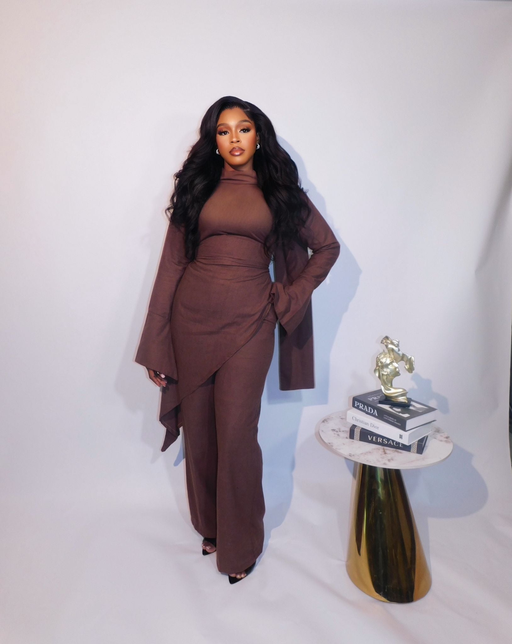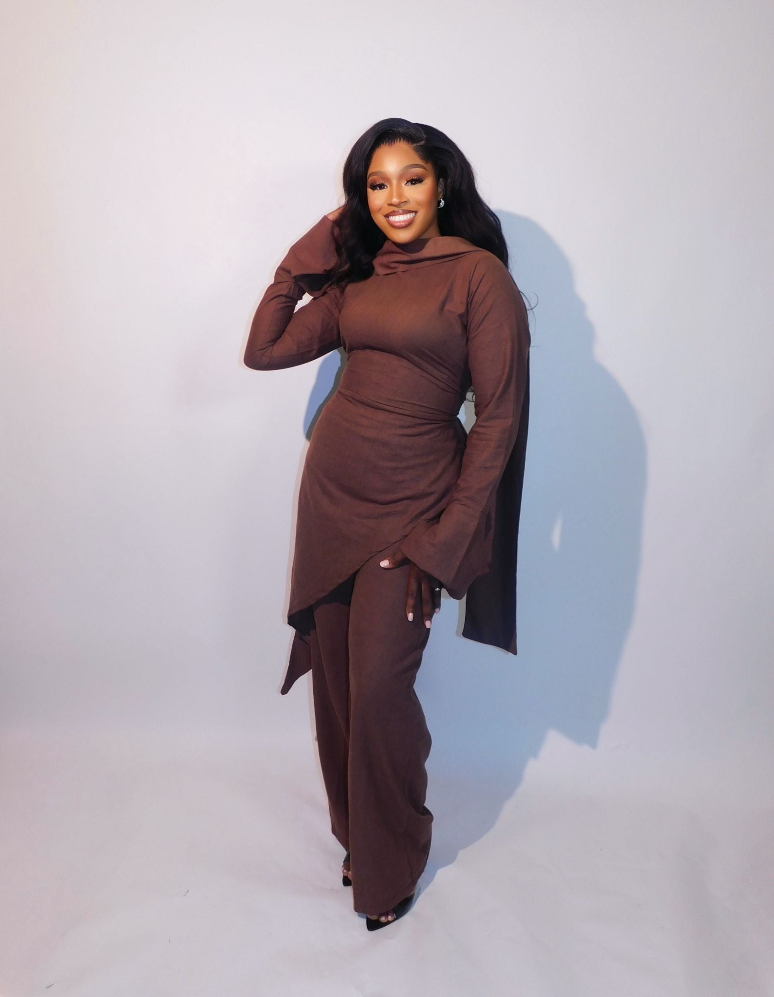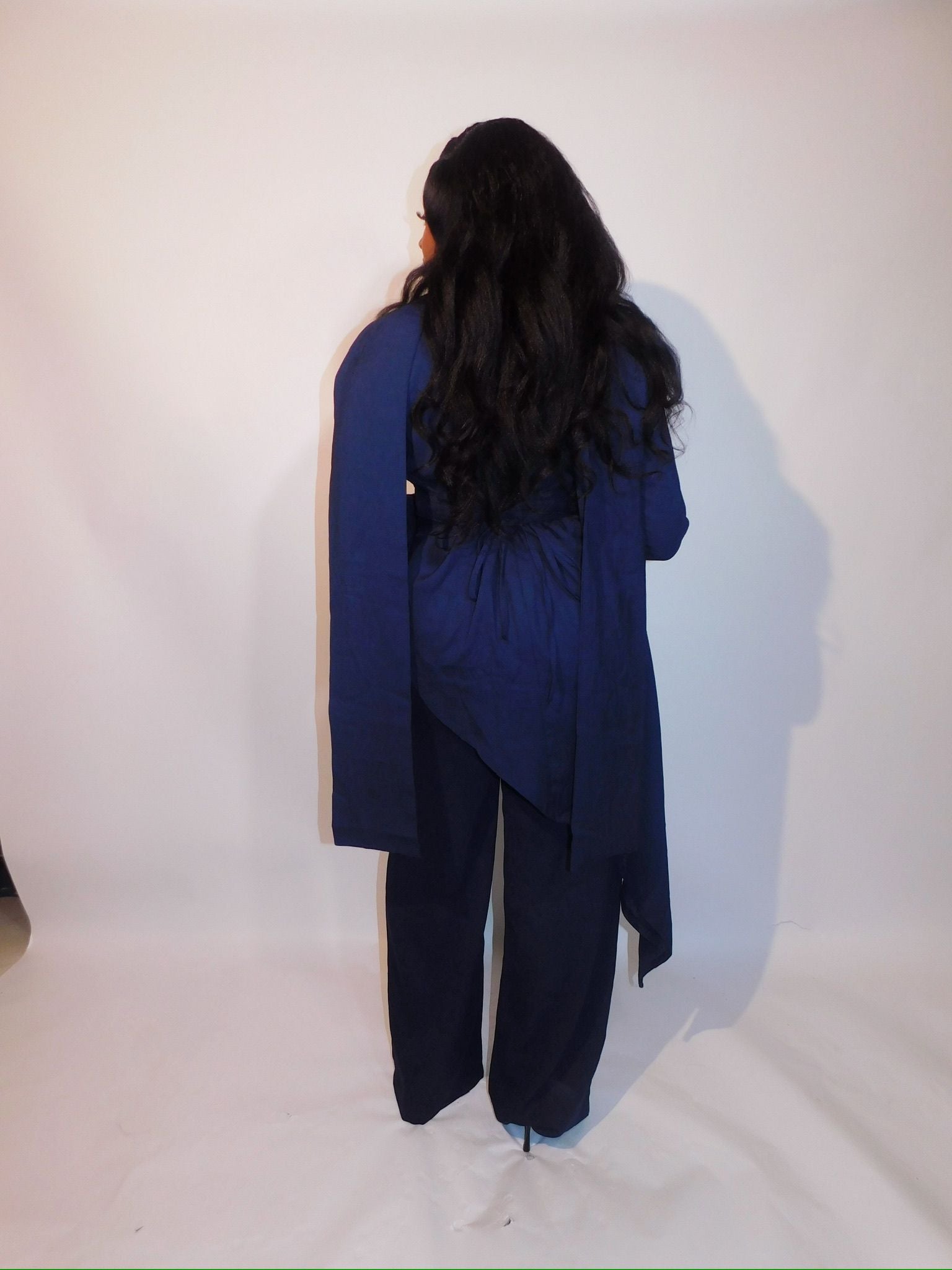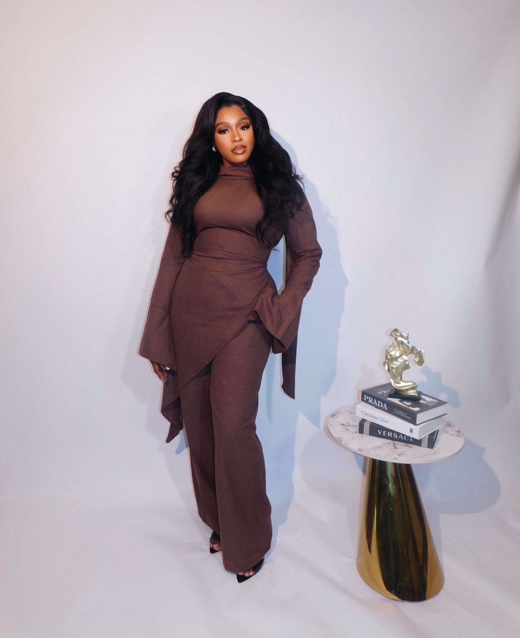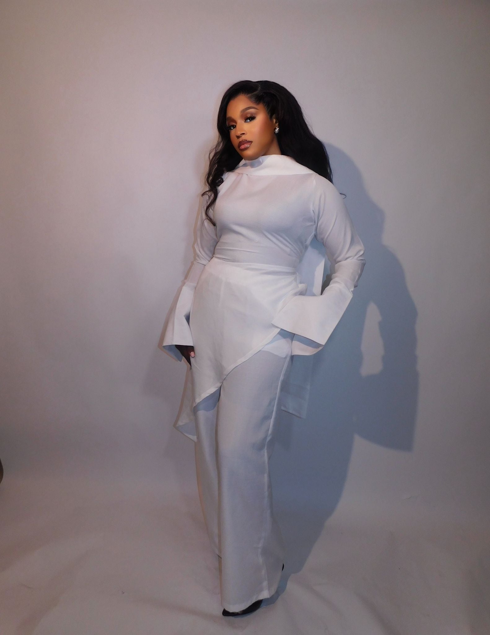 Son haut asymétrique à col montant et manches évasées façon cape sublime la silhouette sans la dévoiler, tandis que le pantalon large apporte une allure allongée et gracieuse.